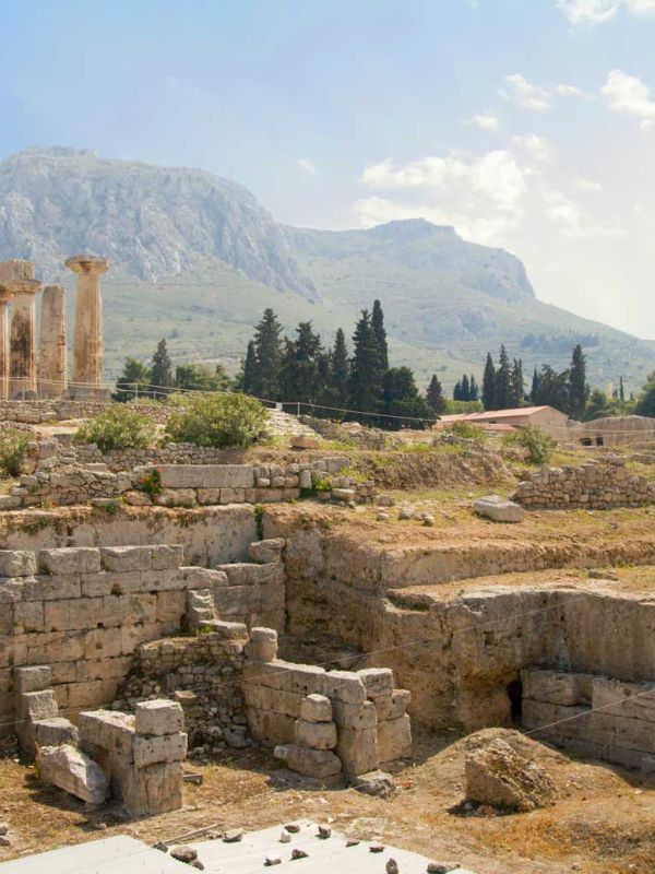 Approximately 5 km (3 miles) south of the modern capital lies Ancient Corinth, where you can visit its archaeological site to wander through the Agora (=ancient marketplace), see the Fountains of Glauke and Peirene, visit the Temple of Apollo, and hear the echoes of ancient drama and music at the Odeion.
