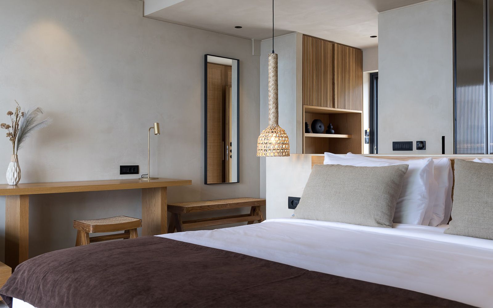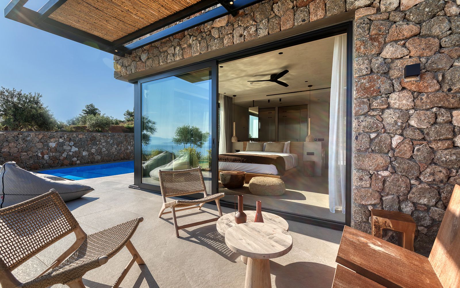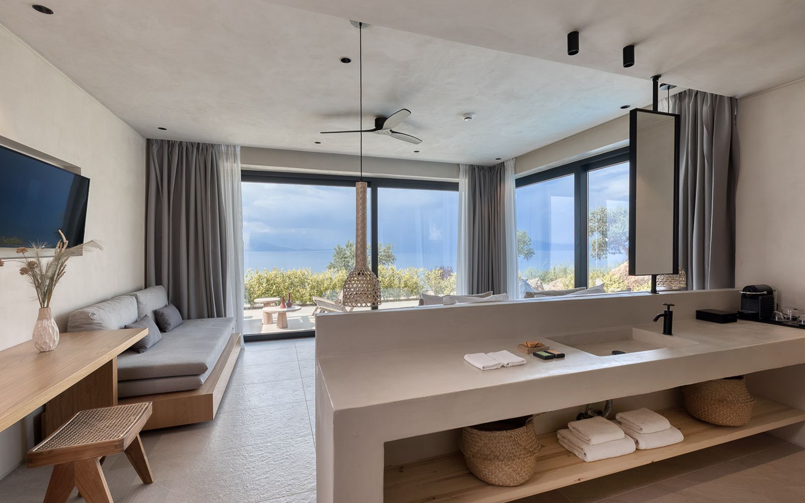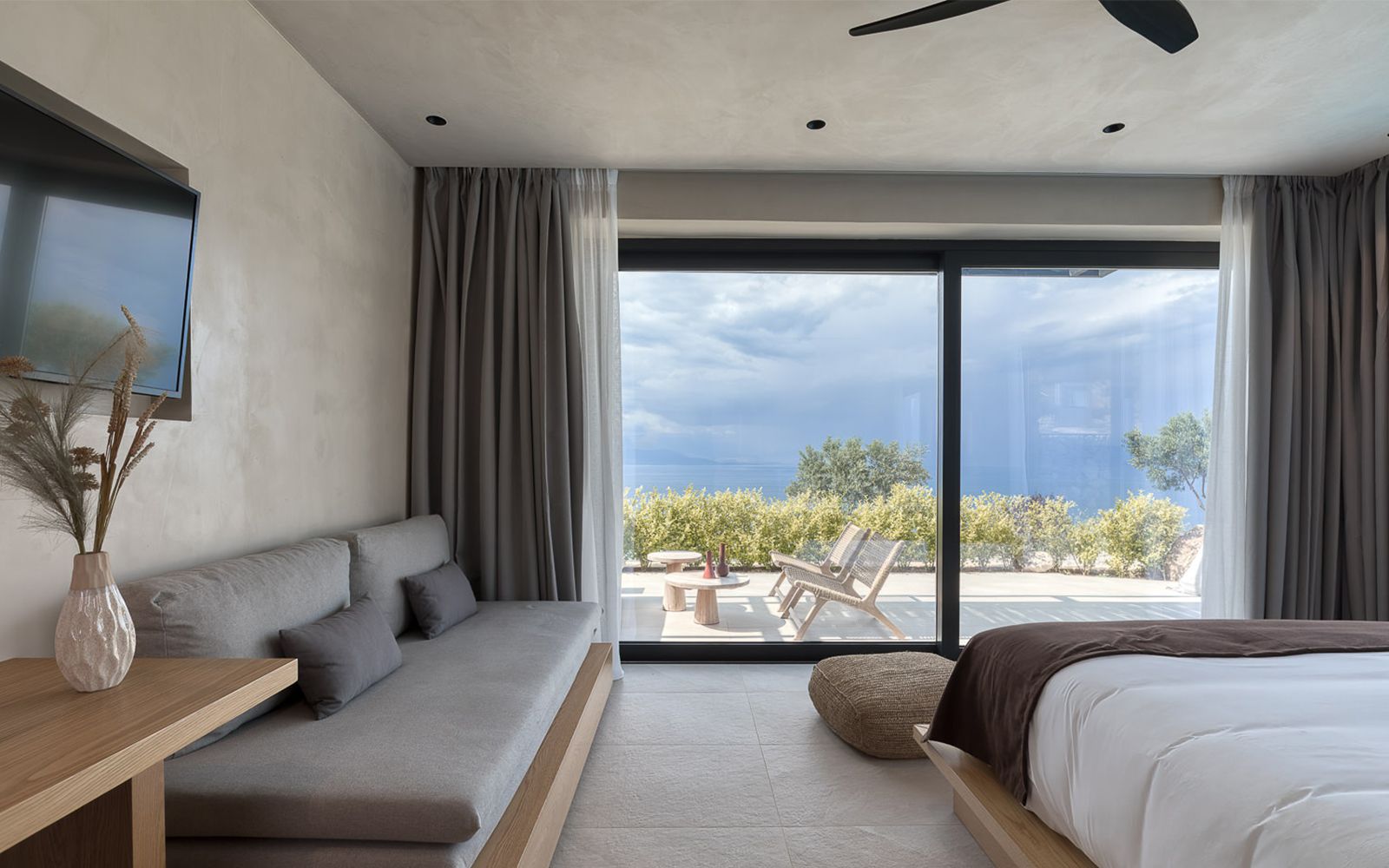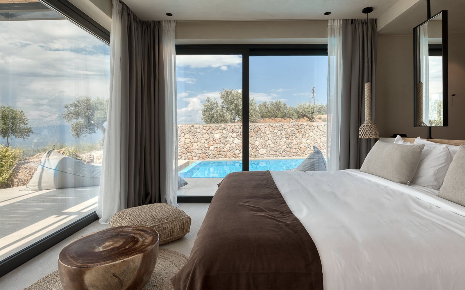 With 34 sqm our Junior Suite offers enough space to unwind on your holiday, featuring an open plan bedroom with a living room. Behind closed doors, the interior is filled with simple and chic luxuries as well as authentic carefully chosen wooden furnishings in a modern minimalist style. The suite comes with a luxurious en-suite bathroom with rain shower. From the spacious 40sqm private terrace you’ll have access to your very own large swimming pool, boasting breathtaking views of the Corinthian Gulf.